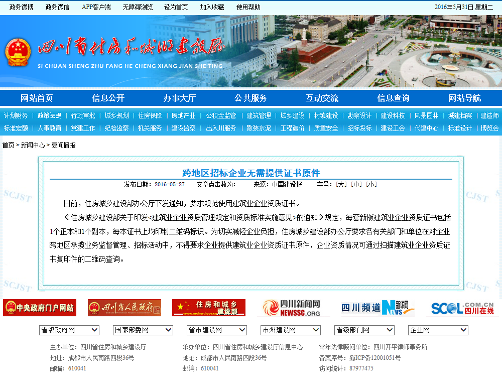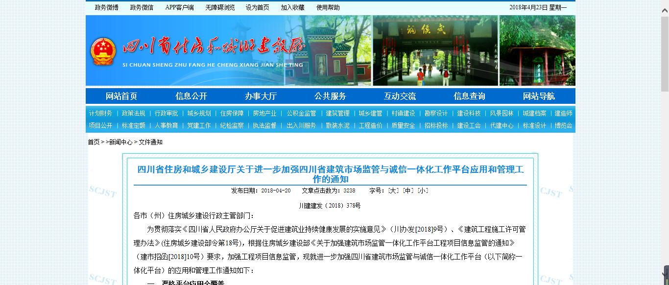 四川省住房和城鄉(xiāng)建設(shè)廳關(guān)于深化省建筑市場監(jiān)管與誠信一體化平臺應(yīng)用管理工作的通知 發(fā)布日期:2017-03-16文章點擊數(shù)為: 45318 字號:[大...